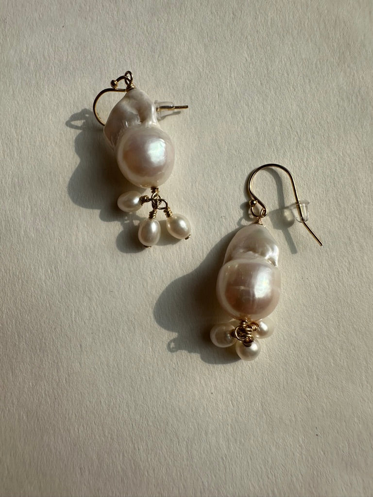 Striking fireball baroque pearls paired with delicate rice pearls create earrings that command attention without...