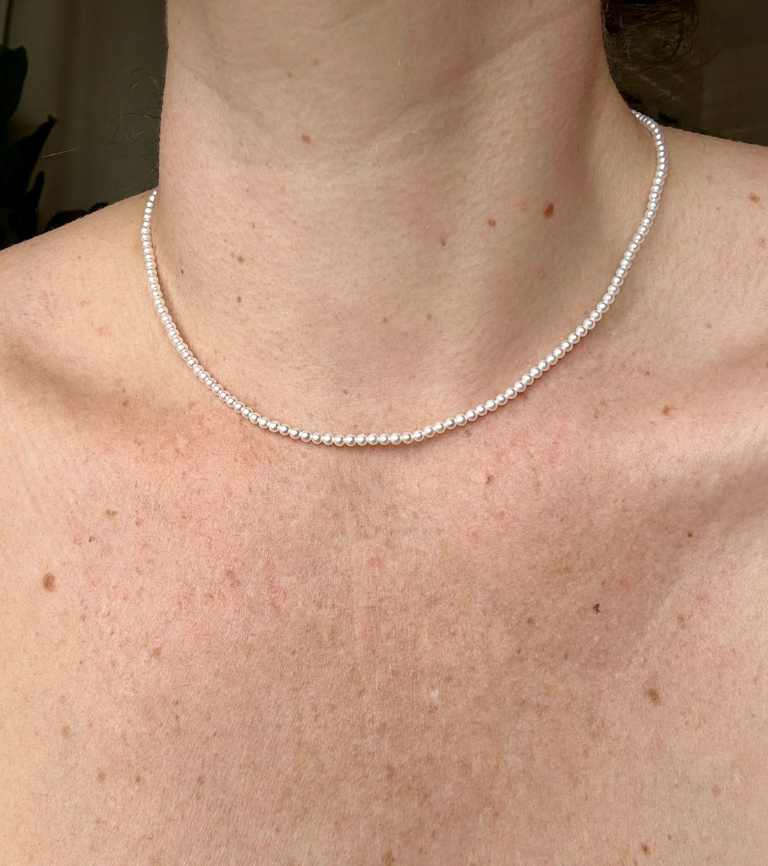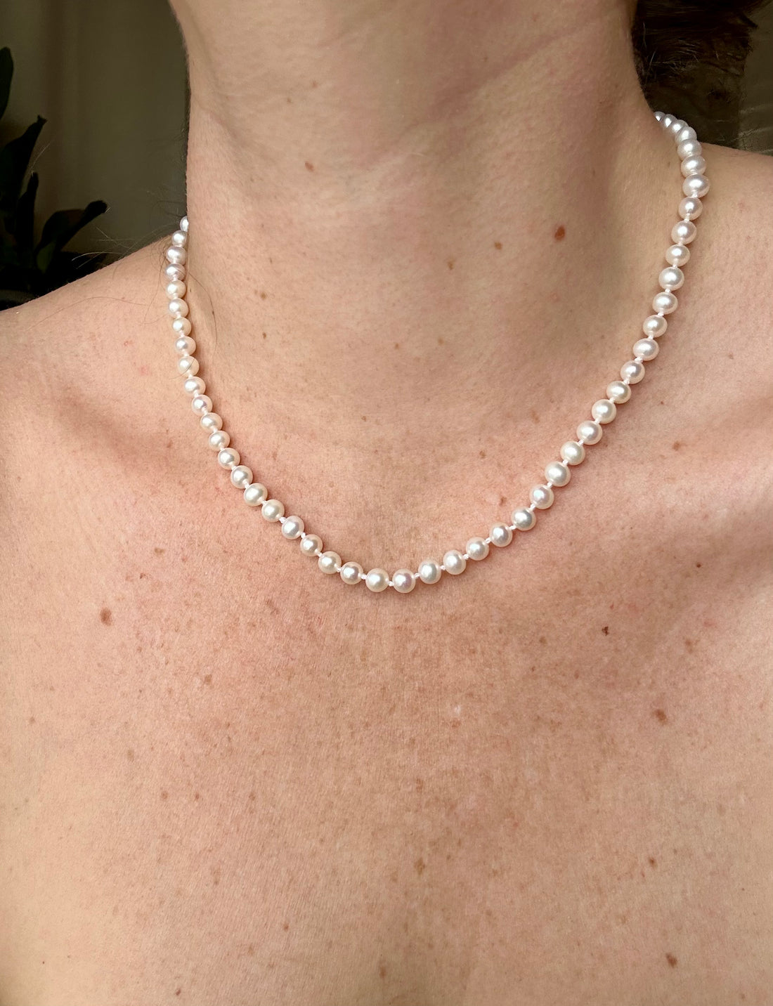 Hand-knotted rice pearls on silk thread with a sterling silver clasp—18 inches of understated elegance....