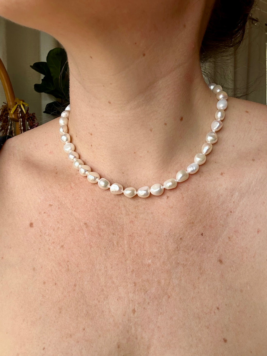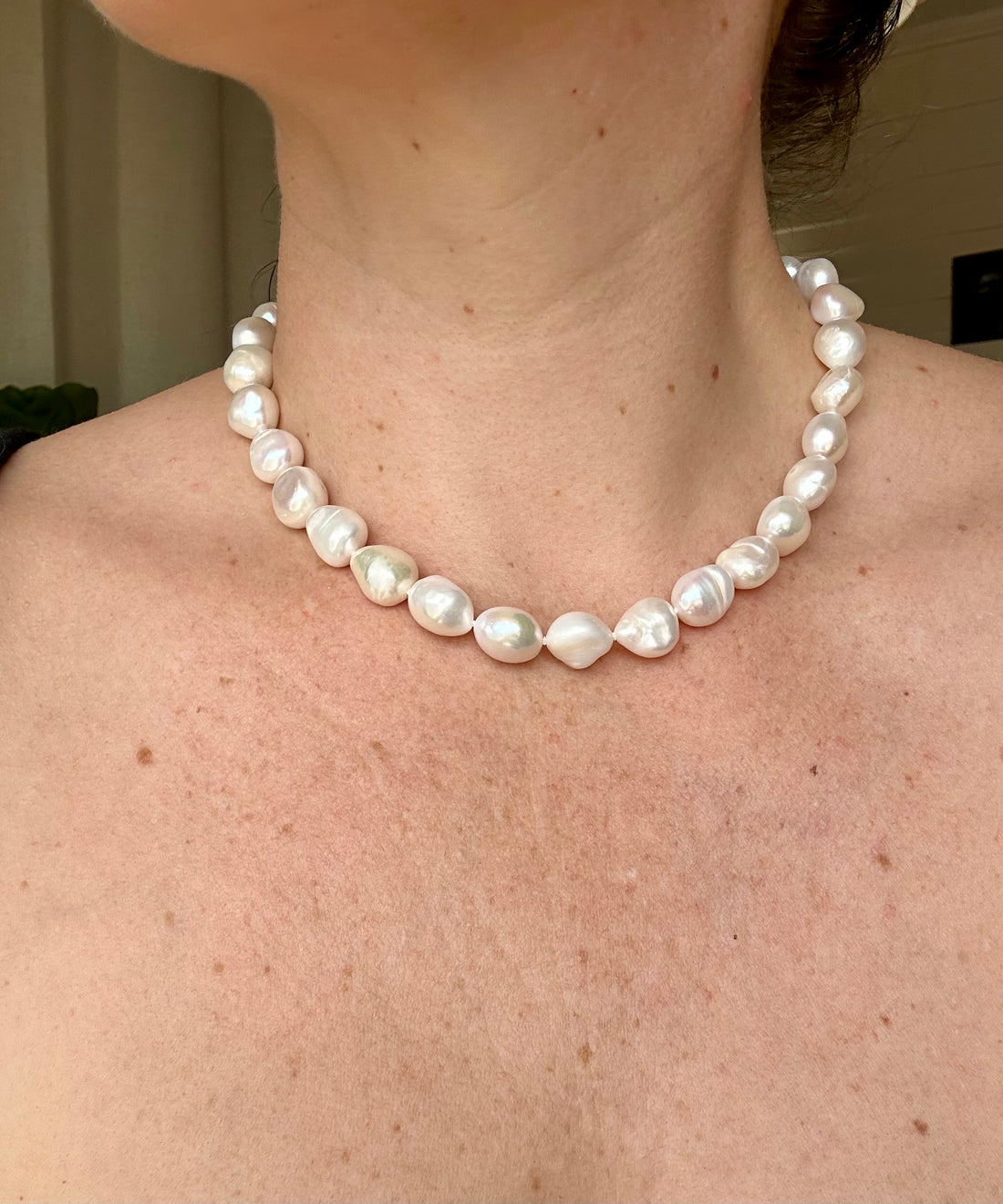 Radiant baroque pearls hand knotted on silk thread and finished with a sterling silver clasp—this...