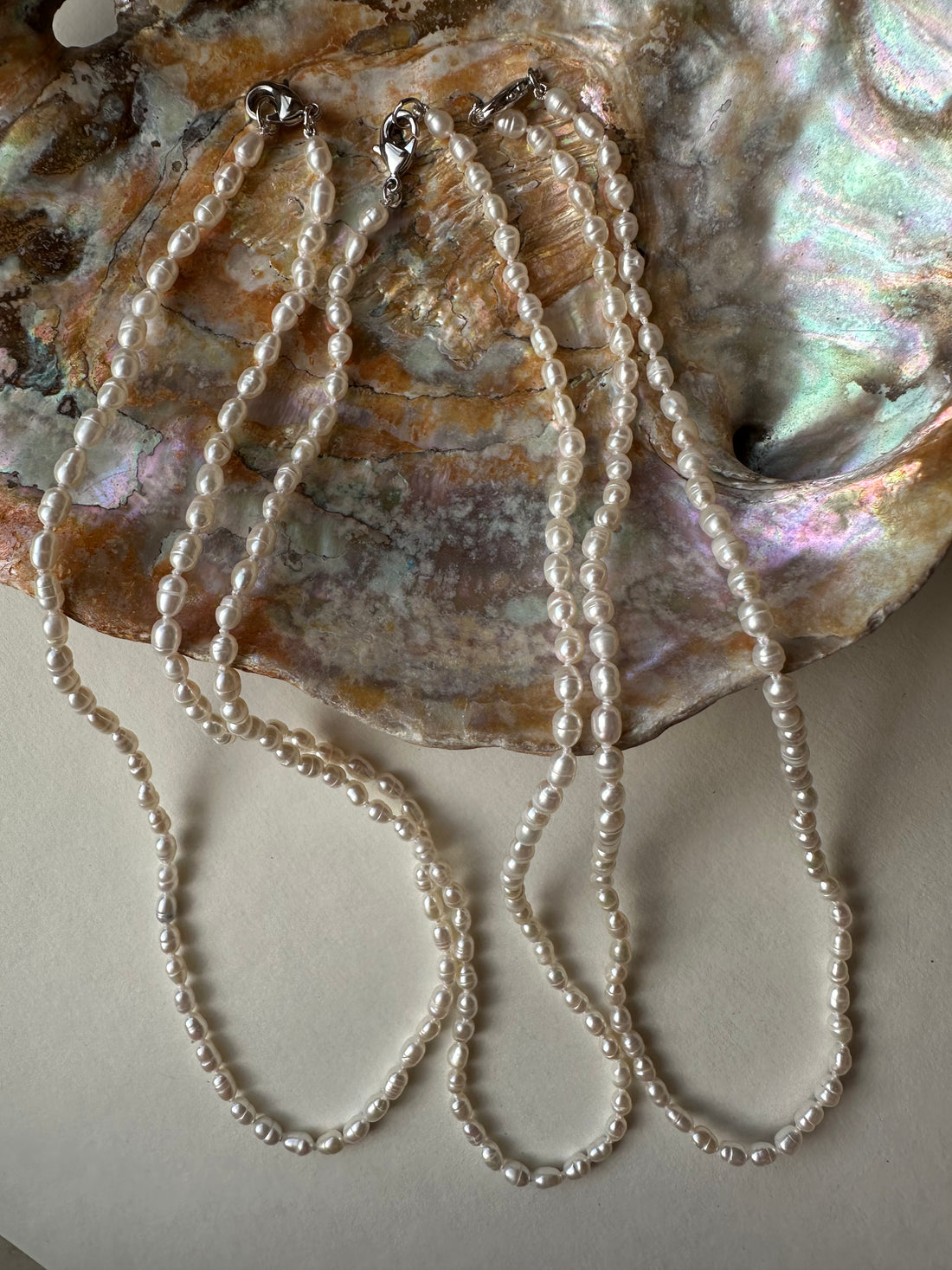 Hand-knotted rice pearls on silk thread with a sterling silver clasp—18 inches of understated elegance....