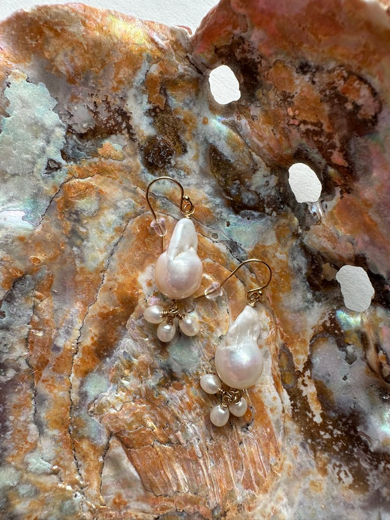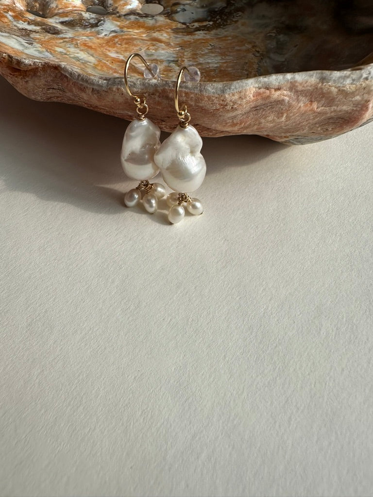 Striking fireball baroque pearls paired with delicate rice pearls create earrings that command attention without sacrificing grace. Rooted in vintage aesthetics with a contemporary twist, these earthy beauties elevate any look—especially during the holiday season.