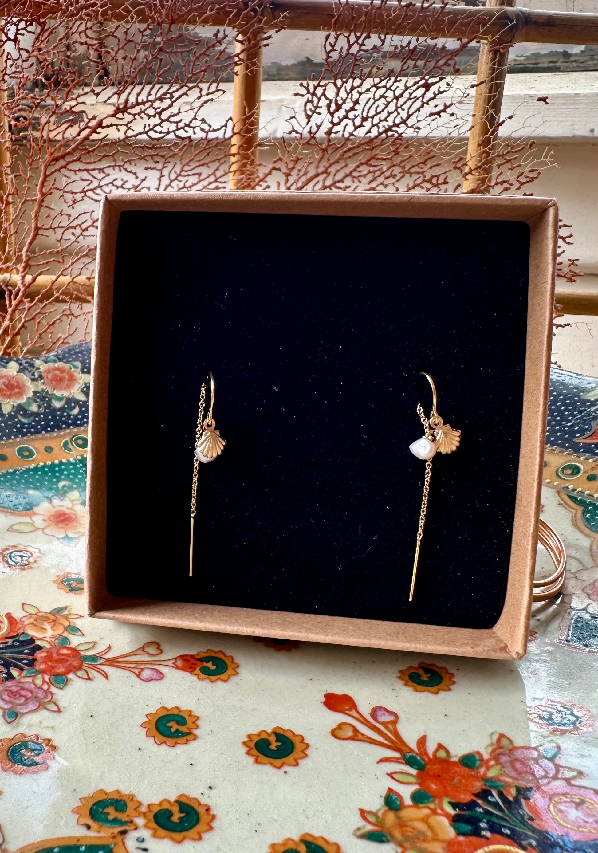 Threader earrings featuring genuine pearls nestled in delicate gold clam shells—a wearable symbol of self-protection and inner value.